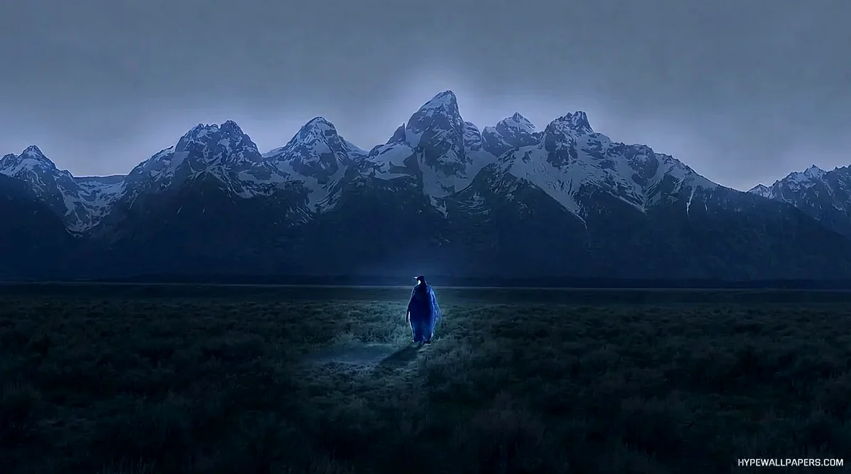 Penguin walking towards "Ye" mountains