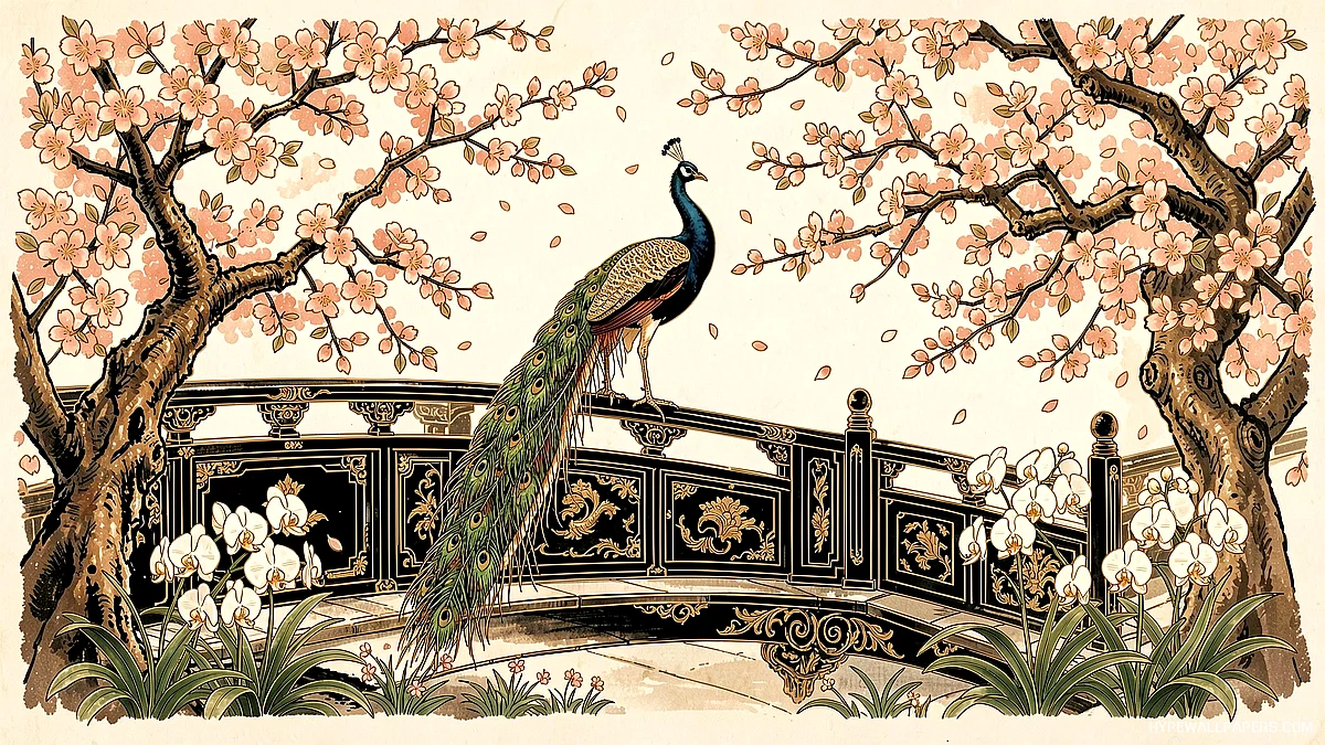 peacock with cherry blossom